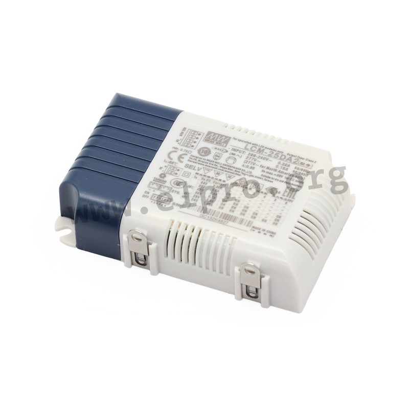 LED switching power supplies in a plastic case (IP20) with a constant current (selectable through a DIL switch), a DALI (LCM-25DA) resp. a DALI 2.0 interface (LCM-25DA2), 25W and protection class II. These devices are protected against overvoltage, short circuit, overload (auto recovery) as well as overtemperature and comply with EN61347-1, EN61347-2-13 as well as EN55015. They have a dimming function (0 to 10V, PWM) as well as a built-in active PFC function and are suitable for LED lightning applications. We offer the following types of this Mean Well series: LCM-25, LCM-25DA and LCM-25DA2.