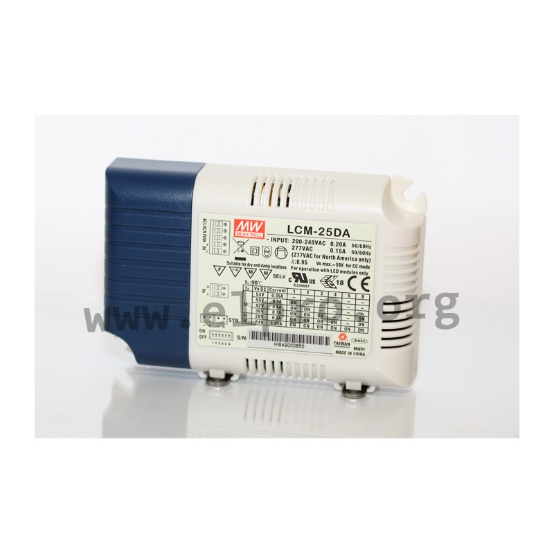 LED switching power supplies in a plastic case (IP20) with a constant current (selectable through a DIL switch), a DALI (LCM-25DA) resp. a DALI 2.0 interface (LCM-25DA2), 25W and protection class II. These devices are protected against overvoltage, short circuit, overload (auto recovery) as well as overtemperature and comply with EN61347-1, EN61347-2-13 as well as EN55015. They have a dimming function (0 to 10V, PWM) as well as a built-in active PFC function and are suitable for LED lightning applications. We offer the following types of this Mean Well series: LCM-25, LCM-25DA and LCM-25DA2.