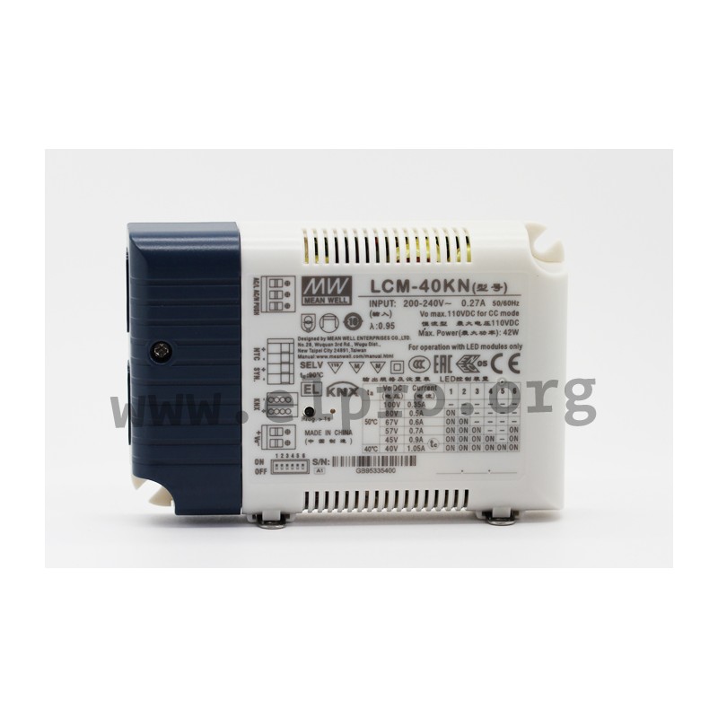 LED drivers in a plastic housing with 40W, a KNX interface, a constant current and a KNX push button. These SELV compliant devices have a built-in active PFC function and are protected against overload (auto recovery), overvoltage, overtemperature as well as short circuit. They are suitable for LED lighting applications, have a DIL switch for selecting the constant current and comply with EN61347-1, EN61347-2-13, EN61000-3-2 class C, EN55015 as well as EN61547. We offer the type LCM-40KN of this Mean Well series.