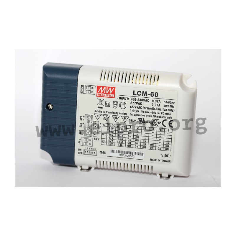 LED drivers in a plastic case (IP20) with a constant current (selectable through a DIL switch), protection class II and 60W. These devices are protected against overtemperature, short circuit, overload (auto recovery) as well as overvoltage and comply with EN61347-1, EN61347-2-13 as well as EN55015. They are suitable for LED lightning applications and have a dimmung function (dim-to-off) as well as a built-in active PFC function. We offer the following types of this Mean Well series: LCM-60, LCM-60DA and LCM-60DA2.