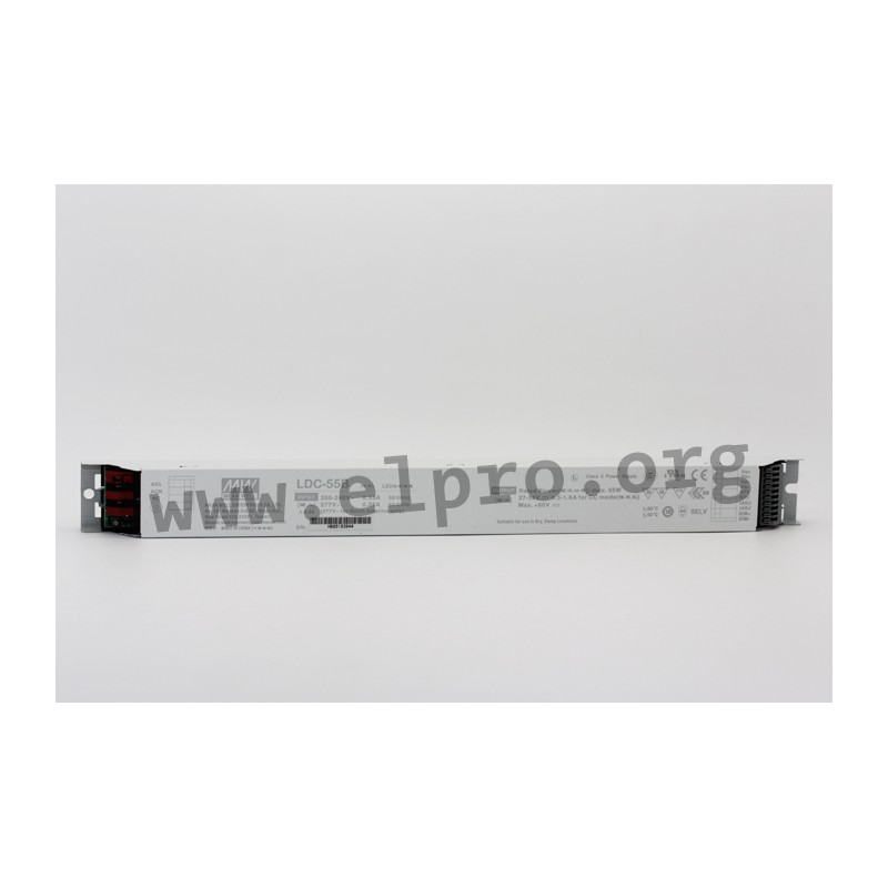 LED drivers in a metal housing with an adjustable output current, 55W and a constant power. These flickerfree devices are protected against overload (auto recovery), overvoltage as well as short circuit and comply with UL8750, EN61347-1, EN61347-1-13, EN61347-2-13 as well as EN55015. They are suitable for LED lighting applications and have a built-in active PFC function. We offer the following types of this Mean Well series: LDC-55 (not dimmable), LDC-55B (3 in 1 dimming function, adjustable 0 to 10V DC, 10V PWM, potentiometer), LDC-55DA (DALI, push dimming) and LDC-55DA2 (DALI 2.0 interface).