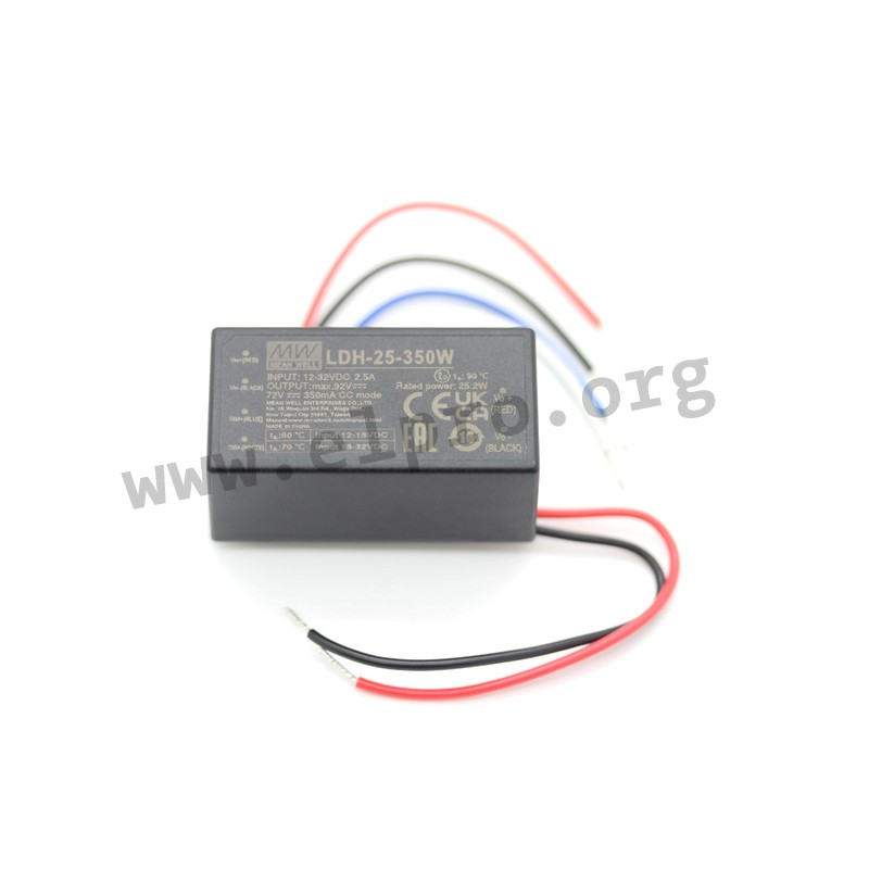 DC/DC step-up converters with 25W, a constant current output and a wide input voltage range. These devices have a dimming function (0 to 10V DC, PWM), are suitable for LED lightning applications and protected against short circuit as well as overvoltage. They are available as versions with wires (LDH-25_W) or soldering pins (LDH_) and comply with EN55015, IEC61347-1 as well as IEC61347-2-13. We offer the following types of this Mean Well series: LDH-25-250, LDH-25-350, LDH-25-500, LDH-25-700, LDH-25-250W, LDH-25-350W, LDH-25-500W and LDH-25-700W.