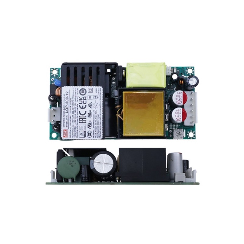 Open frame switching power supplies with 200W (forced air), a compact size (4"x2"), a low no-load power, an adjustable output voltage and protection class I/II. These devices have a peak load capability of 150%, a built-in active PFC function and are protected against overload, overvoltage as well as short circuit. They are suitable for medical technology applications (2xMOPP), have an auxiliary output for an external fan (12V/0,5A) and comply with EN62368-1, EN60335-1, EN61558-1, EN61558-2-16, EN60601-1 as well as EN55032 class A/B. We offer the following types of this Mean Well series: LOP-200-12, LOP-200-15, LOP-200-18, LOP-200-24, LOP-200-27, LOP-200-36, LOP-200-48 and LOP-200-54.