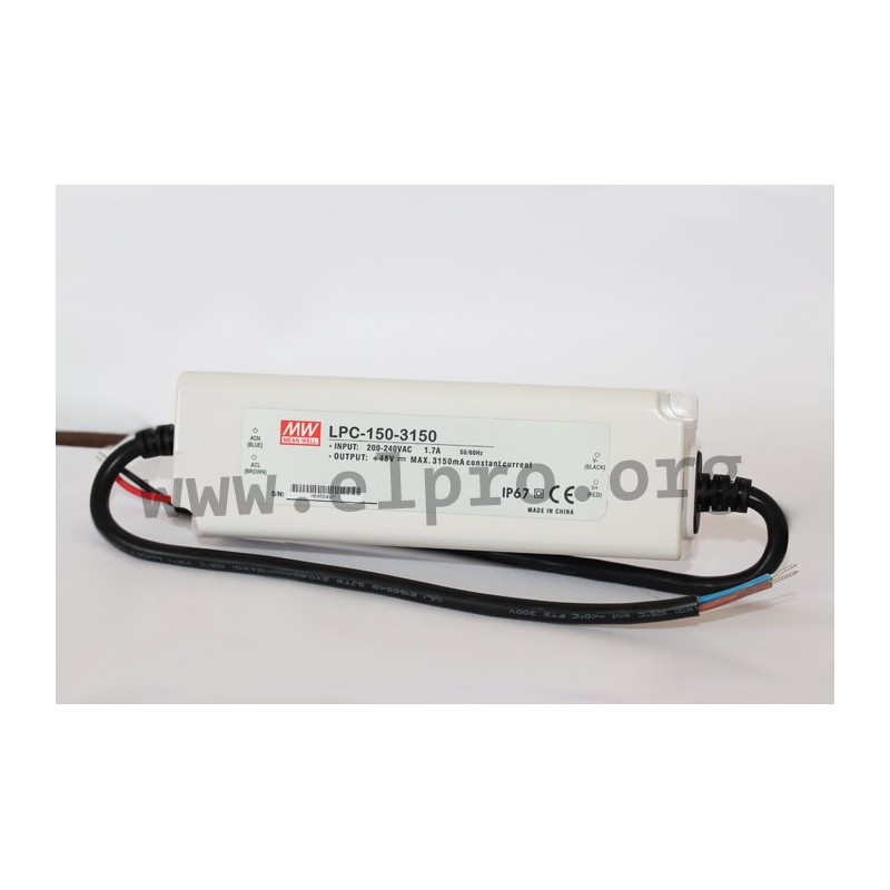 LED drivers in a plastic housing (IP67) with a constant current, 150W and protection class II. These devices comply with EN62368-1, IEC62368-1 as well as EN55032 class B and are not dimmable. They are suitable for LED lighting applications and are protected against overload (auto recovery), overvoltage as well as short circuit. We offer the following types of this Mean Well series: LPC-150-350, LPC-150-500, LPC-150-700, LPC-150-1050, LPC-150-1400, LPC-150-1750, LPC-150-2100, LPC-150-2450, LPC150-2800 and LPC-150-3150.