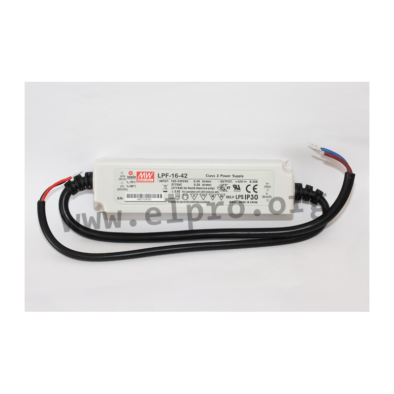 LED drivers in a plastic housing (IP30) with a constant voltage/constant current (mixed mode), 16W and a universal input. These devices are suitable for LED lighting applications and comply with UL1310 Class 2, EN61000-3-2, Class C, EN55015, EN61347-1 as well as EN61347-2-13. They are protected against overload (auto recovery), overvoltage as well as short circuit and have a built-in active PFC function. We offer the following types of this Mean Well series: LPF-16-12, LPF-16-15, LPF-16-20, LPF-16-24, LPF-16-30, LPF-16-36, LPF-16-42, LPF-16-48 and LPF-16-54.