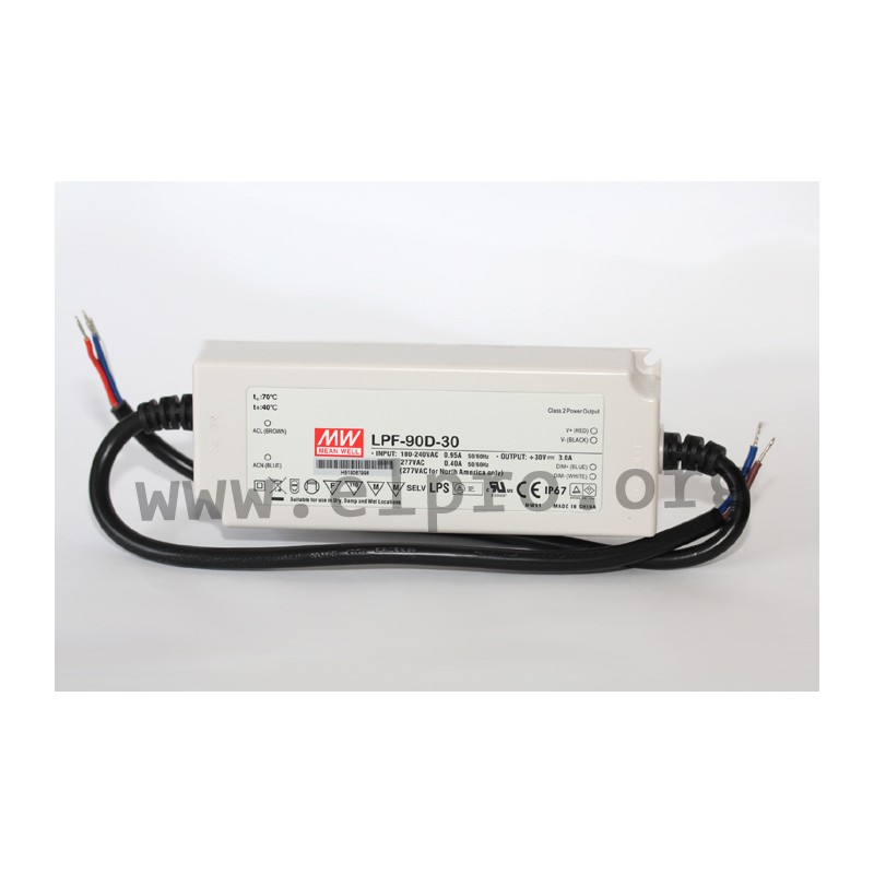 LED drivers in a plastic housing (IP67) with a 3 in 1 dimming function (external voltage 1 to 10V DC, PWM, potentiometer) and 90W. These devices comply with UL1310 class 2, EN61000-3-2 class C, EN55015, EN61347-1 as well as EN61347-2-13 and are protected against overload (auto recovery), overvoltage as well as short circuit. They have a built-in active PFC function and are suitable for LED lighting applications. We offer the following types of this Mean Well series: LPF-90D-15, LPF-90D-20, LPF-90D-24, LPF-90D-30, LPF-90D-36, LPF-90D-42, LPF-90D-48 and LPF-90D-54.