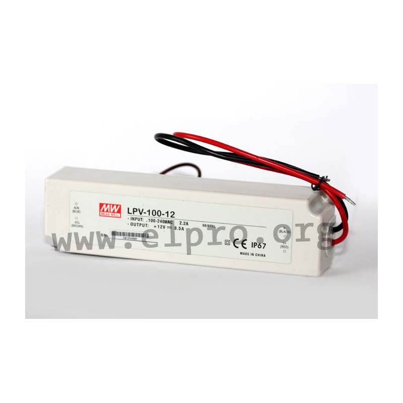 LED drivers in a plastic housing (IP67) with a universal input, 100W and a constant voltage. These devices are protected against short circuit, overvoltage as well as overload (auto recovery) and comply with UL8750, EN62368-1, IEC62368-1 as well as EN55032 class B. They are suitable for LED lighting applications and are not dimmable. We offer the following types of this Mean Well series: LPV-100-5, LPV-100-12, LPV-100-15, LPV-100-24, LPV-100-36 and LPV-100-48.