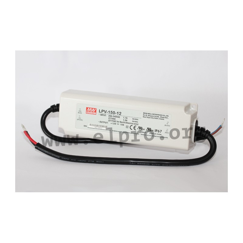 LED drivers in a plastic housing (IP67) with a constant voltage and 150W. These devices are not dimmable and are suitable for LED lighting applications. They comply with UL8750, IEC62368-1, EN62368-1 as well as EN55032 class B and are protected against overload (auto recovery), overvoltage as well as short circuit. We offer the following types of this Mean Well series: LPV-150-12, LPV-150-15, LPV-150-24, LPV-150-36 and LPV-150-48.