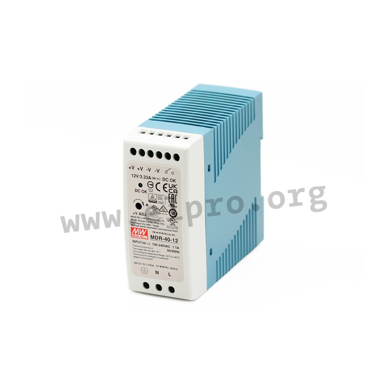 Switching power supplies with 40W, a universal input, an LED indicator for power on, a DC OK relay contact, a low no-load power and screw terminals (touch guard). These devices are suitable for DIN rail mounting and are protected against overload (auto recovery), overvoltage as well as short circuit. They have a fanless design and comply with UL/EN62368-1, EN55032 class B, EN61204-3 class B, EN61000-3-2 as well as EN61000-3-3. We offer the following types of this Mean Well series: MDR-40-5, MDR-40-12, MDR-40-24 and MDR-40-48.