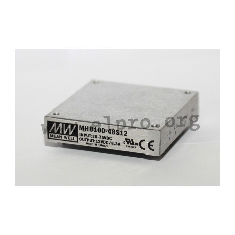 DC/DC converters in a Half-Brick metal housing (2,28"x2,4"x0,5") with 1000W, a remote ON/OFF control, a trimming output (±10%) and a galvanic isolation of input/output. These devices have an input voltage ratio of 2:1 and are protected against overvoltage, overcurrent, overtemperature as well as short circuit. They are suitable for PCB mounting and comply with EN55032 class A as well as EN55024. We offer the following types of this Mean Well series: MHB100-24S05, MHB100-24S12, MHB100-24S24, MHB100-48S05, MHB100-48S12 and MHB100-48S24.