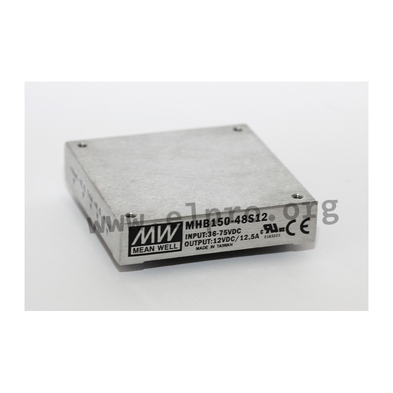 DC/DC converters in a half-brick metal housing (2,28"x2,4"x0,5") with 150W, a regulated output voltage, a remote ON/OFF control and a trimming output (±10%). These devices are suitable for PCB mounting and are protected against overvoltage, overtemperature, short circuit as well as overcurrent. They have an input voltage ratio of 2:1, a galvanic isolation of input/output and comply with EN55032 class A. We offer the following types of this Mean Well series: MHB150-48S12 and MHB150-48S24.