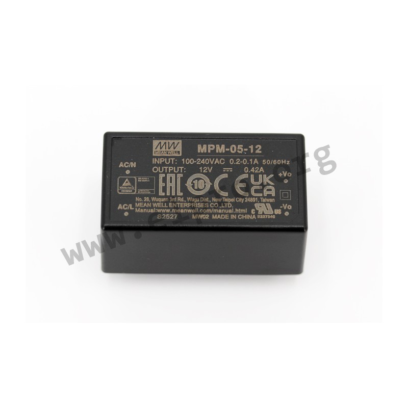 Switching power supplies in an enclosed housing (PCB) with 5W, a universal input and insulation class II. These devices are suitable for medical applications (2xMOPP) and are protected against overload (auto recovery), overtemperature, overvoltage as well as short circuit. They have a low no-load power and comply with EN60601-1. We offer the following types of this Mean Well series: MPM-05-3.3, MPM-05-5, MPM-05-12, MPM-05-15 and MPM-05-24.