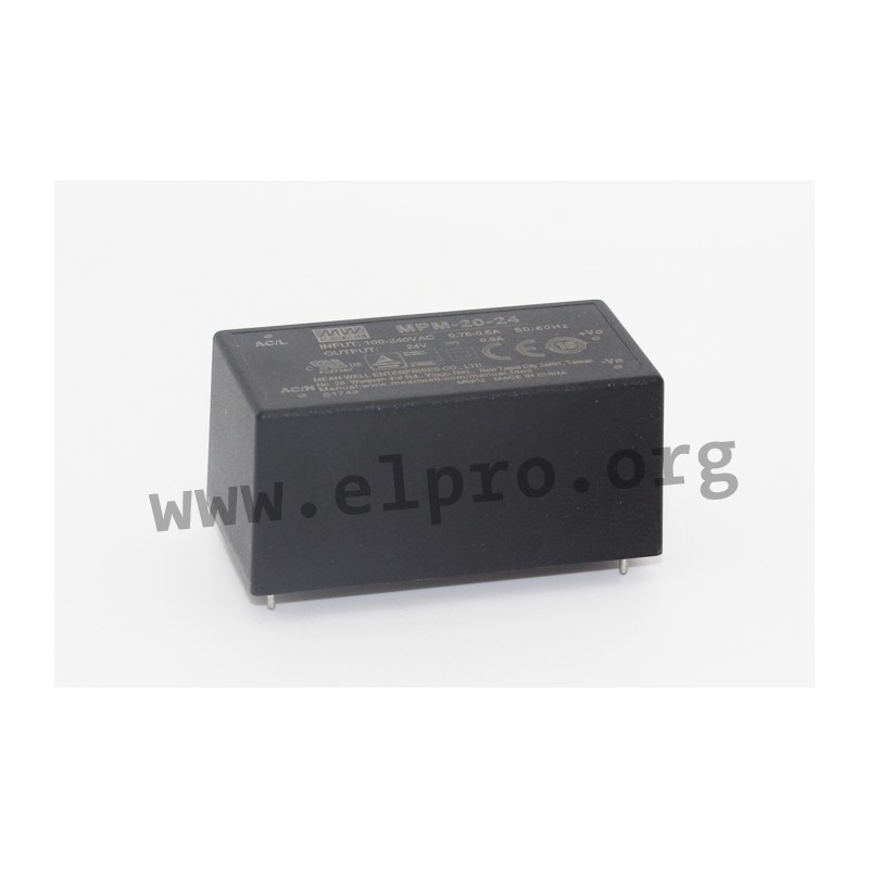 Switching power supplies in an enclosed housing (PCB) with 20W, insulation class II, a low no-load power and a universal input. These devices are suitable for medical applications and are protected against overload (auto recovery), overtemperature, short circuit as well as overvoltage. They are suitable for PCB mounting and comply with EN55015, IEC60601-1, IEC60335-1 as well as EN60335-1. We offer the following types of this Mean Well series: MPM-20-3.3, MPM-20-5, MPM-20-12, MPM-20-15 and MPM-20-24.