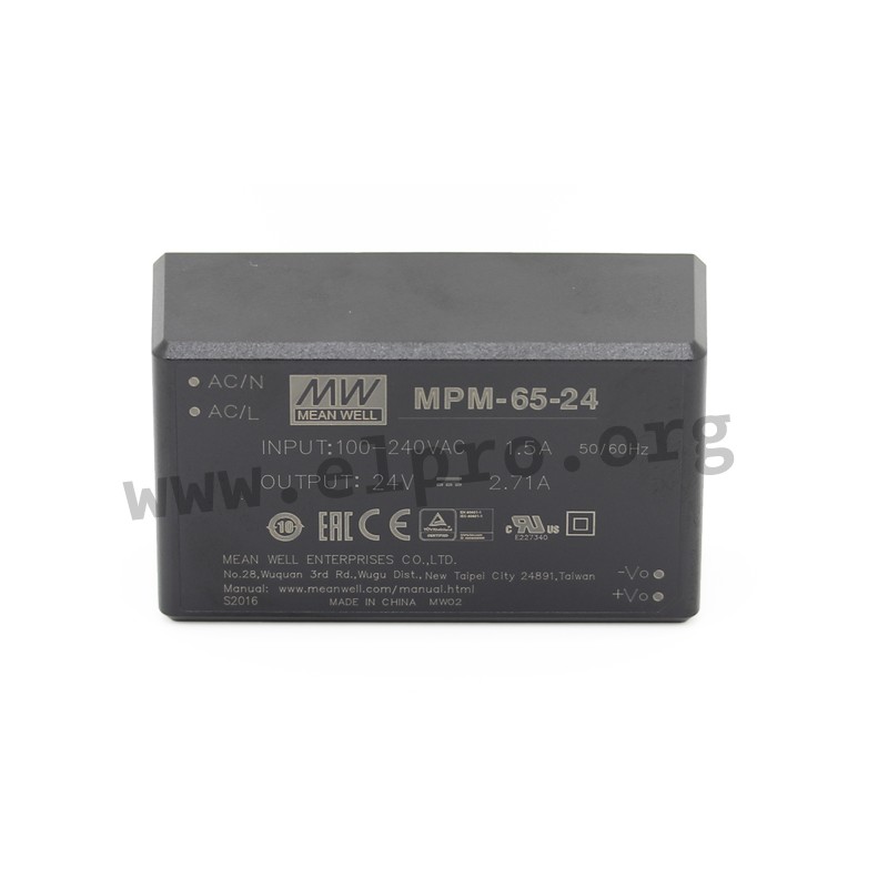 Switching power supplies in an enclosed housing with 65W, a universal input and insulation class II. These devices are suitable for both PCB mounting (MPM-65-_) as well as mounting with screw terminals (MPM-65-_ST) and are protected against short circuit, overload (auto recovery) and overvoltage. They are designed for a peak power of 71W over 10 seconds and comply with EN60601-1 and EN55011 class B. We offer the following types of this Mean Well series: MPM-65-5, MPM-65-12, MPM-65-15, MPM-65-24, MPM-65-48, MPM-65-5ST, MPM-65-12ST, MPM-65-15ST, MPM-65-24ST and MPM-65-48ST.