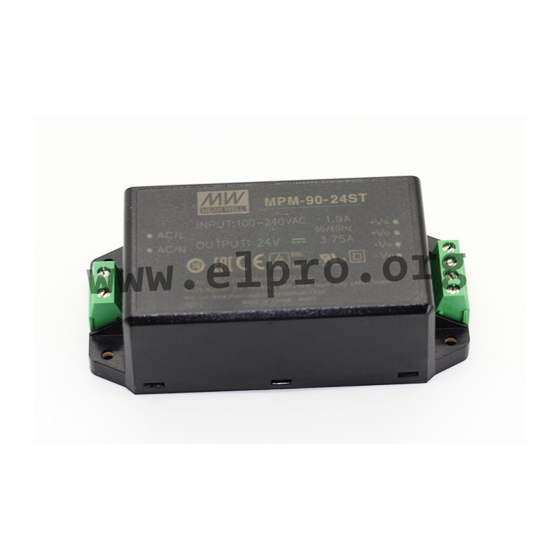 Switching power supplies in an enclosed housing with 90W, a universal input and insulation class II. These devices are protected against overload (auto recovery), short circuit as well as overvoltage and are suitable for either PCB mounting (MPM-90-_) or mounting by screw terminals (MPM-90-_ST). They are rated for a peak power of 100W over 10 seconds and comply wtih EN60601-1 as well as EN55011 class B. We offer the following types of this Mean Well series: MPM-90-12, MPM-90-15, MPM-90-24, MPM-90-48, MPM-90-12ST, MPM-90-15ST, MPM-90-24ST and MPM-90-48ST.