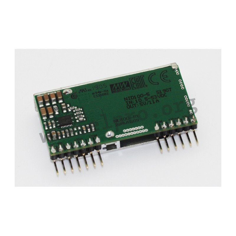 Non-isolated DC/DC converters in an open frame SIL housing with 100W, a regulated output voltage and a remote ON/OFF control. These devices are suitable for PCB mounting and are protected against overload, overvoltage as well as short circuit. They have a fanless design and comply with EN62368-1, EN55032 class A as well as EN55032 class B. We offer the following types of this Mean Well series: NID100-5, NID100-12, NID100-15 and NID100-24.