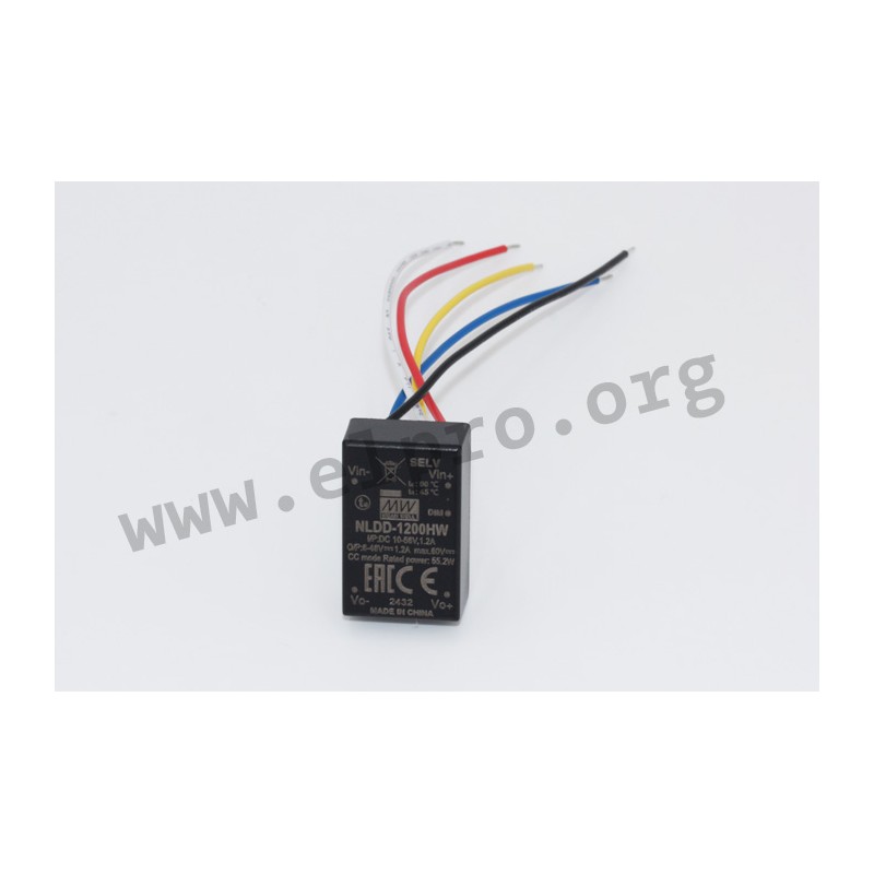 DC/DC Step-Down LED drivers in a plastic housing (UL94V-0) with a constant current output, a wide input voltage range and a remote ON/OFF control. These devices are suitable for LED lightning applications and are protected against overtemperature as well as short circuit. They have a dimming function (PWM) and comply with IEC61547 as well as EN55015. Our product range comprises converters for direct PCB mounting (NLDD-_H) as well as models with stranded wires (NLDD-_HW). We offer the following types of this Mean Well series: NLDD-350H, NLDD-500H, NLDD-700H, NLDD-1050H, NLDD-1200H, NLDD-1400H, NLDD-350HW, NLDD-500HW, NLDD-700HW, NLDD-1050HW, NLDD-1200HW and NLDD-1400HW.