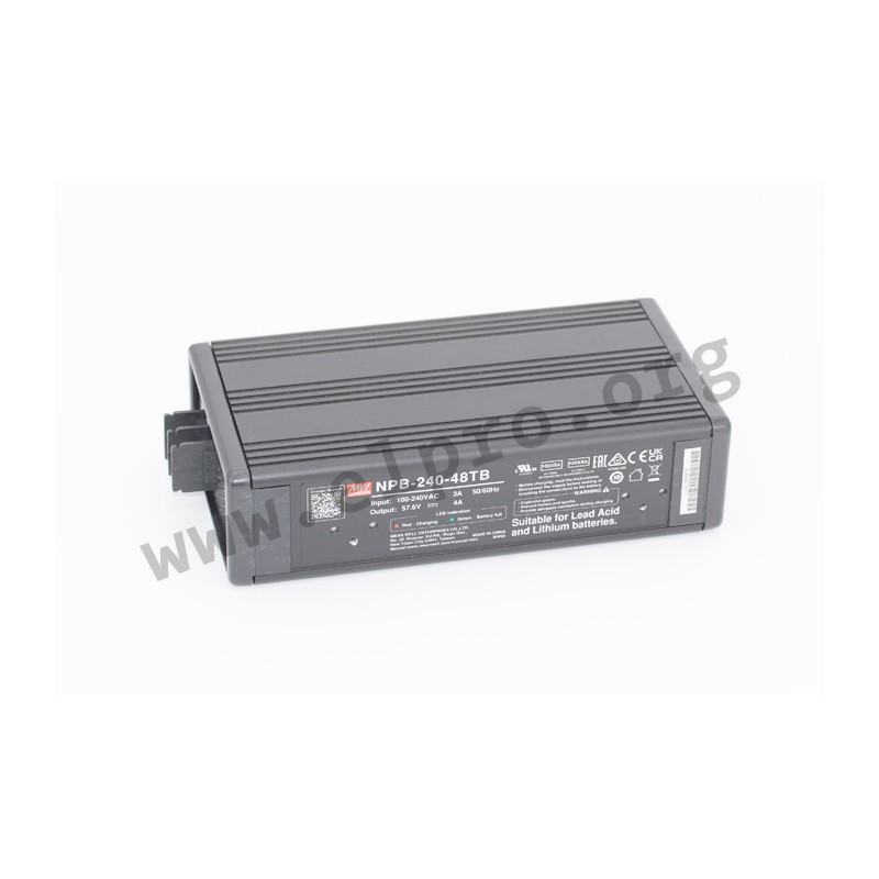 External battery chargers with 240W, a universal input, an adjustable charging voltage/current, an LED status indicator and a low no-load power (<0,15W). These devices are suitable for Li-ion as well as lead-acid batteries and are protected against overvoltage, voltage reversal, short circuit as well as overtemperature. They have a DIL switch for selecting the charging stage (2/3) and comply with EN62368-1, EN60335-1/2-29, EN55032 class B, EN61000-3-2 class A as well as EN61000-3-3. We offer the following types of this Mean Well series: NPB-240-12TB, NPB-240-24TB and NPB-240-48TB as well as the versions NPB-240-12XLR, NPB-240-24XLR and NPB-240-48XLR with an XLR connector and the types NPB-240-12AD1, NPB-240-24AD1 and NPB-240-48AD1 with an Anderson connector.