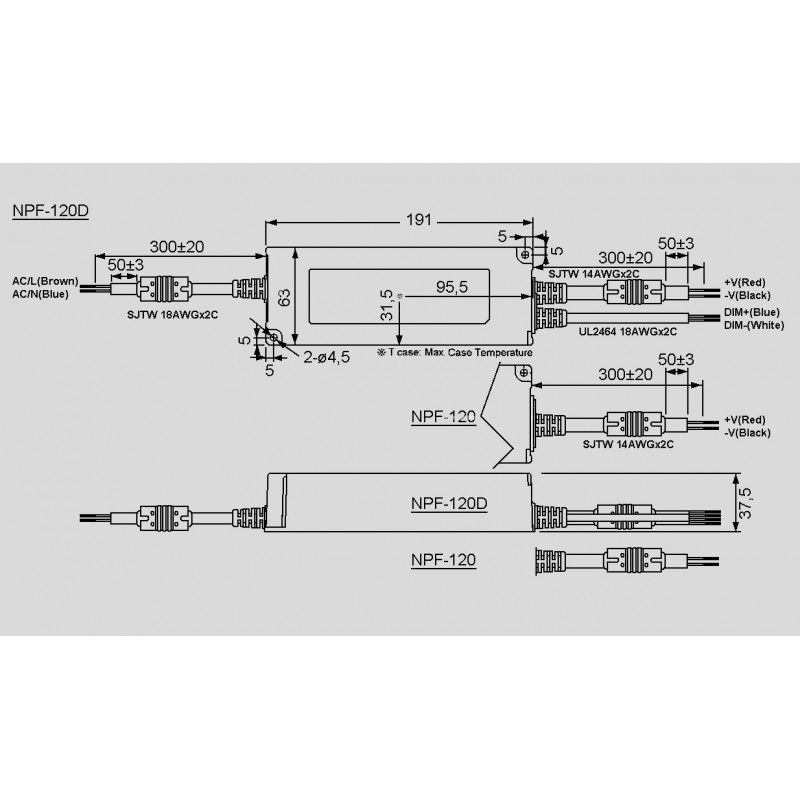 LED drivers in a plastic housing (IP67) with a constant current, 120W, a 3 in 1 dimming function (external voltage 0 to 10V DC, PWM, potentiometer) and a low no-load power. These devices comply with EN61000-3-2, class C, EN55015, EN61347-1 as well as EN61347-2-13 and are protected against overload (auto recovery), overvoltage as well as short circuit. They have a built-in active PFC function and are suitable for LED lighting applications. We offer the following types of this Mean Well series: NPF-120D-12, NPF-120D-15, NPF-120D-20, NPF-120D-24, NPF-120D-30, NPF-120D-36, NPF-120D-42, NPF-120D-48 and NPFD-120-54.