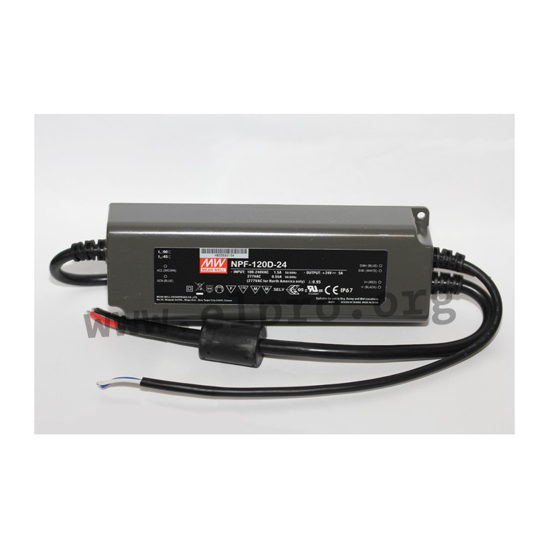 LED drivers in a plastic housing (IP67) with a constant current, 120W, a 3 in 1 dimming function (external voltage 0 to 10V DC, PWM, potentiometer) and a low no-load power. These devices comply with EN61000-3-2, class C, EN55015, EN61347-1 as well as EN61347-2-13 and are protected against overload (auto recovery), overvoltage as well as short circuit. They have a built-in active PFC function and are suitable for LED lighting applications. We offer the following types of this Mean Well series: NPF-120D-12, NPF-120D-15, NPF-120D-20, NPF-120D-24, NPF-120D-30, NPF-120D-36, NPF-120D-42, NPF-120D-48 and NPFD-120-54.