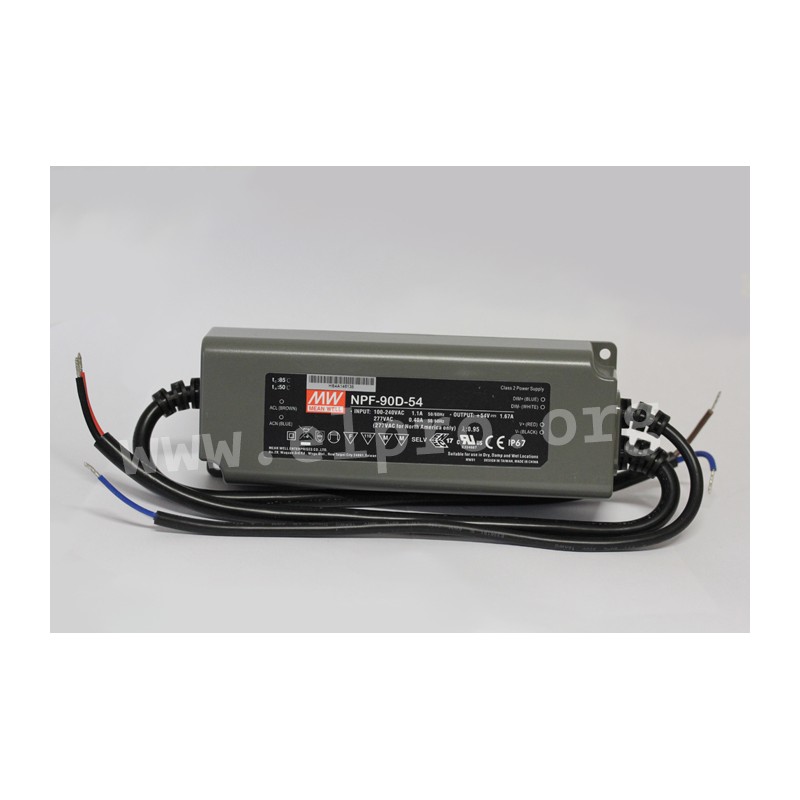 LED drivers in a plastic housing (IP67) with a low no-load power, 90W and a 3 in 1 dimming function (external voltage 0 to 10V DC, PWM, potentiometer). These devices are protected against overload (auto recovery), short circuit as well as overvoltage and comply with EN61000-3-2 class C, EN55015, EN61347-1 as well as EN61347-2-13. They have a built-in active PFC function and are suitable for LED lighting applications. We offer the following types of this Mean Well series: NPF-90D-12, NPF-90D-12EU, NPF-90D-15, NPF-90D-20, NPF-90D-24, NPF-90D-30, NPF-90D-36, NPF-90D-42, NPF-90D-48 and NPF-90D-54.