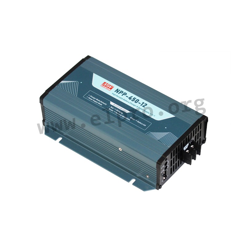 External battery chargers with 450W, a 3-stage charging curve and a remote ON/OFF control. These devices are usable as power supplies as well as battery chargers, are suitable for lead-acid batteries and are protected against overload, overvoltage, overtemperature as well as short circuit. They have a potentiometer for adjusting the output voltage / output current and comply with EN62368-1, EN60335-1/2-29, EN55032 class B as well as EN55014-1 class B. We offer the following types of this Mean Well series: NPP-450-12, NPP-450-24, NPP-450-48 and NPP-450-72.