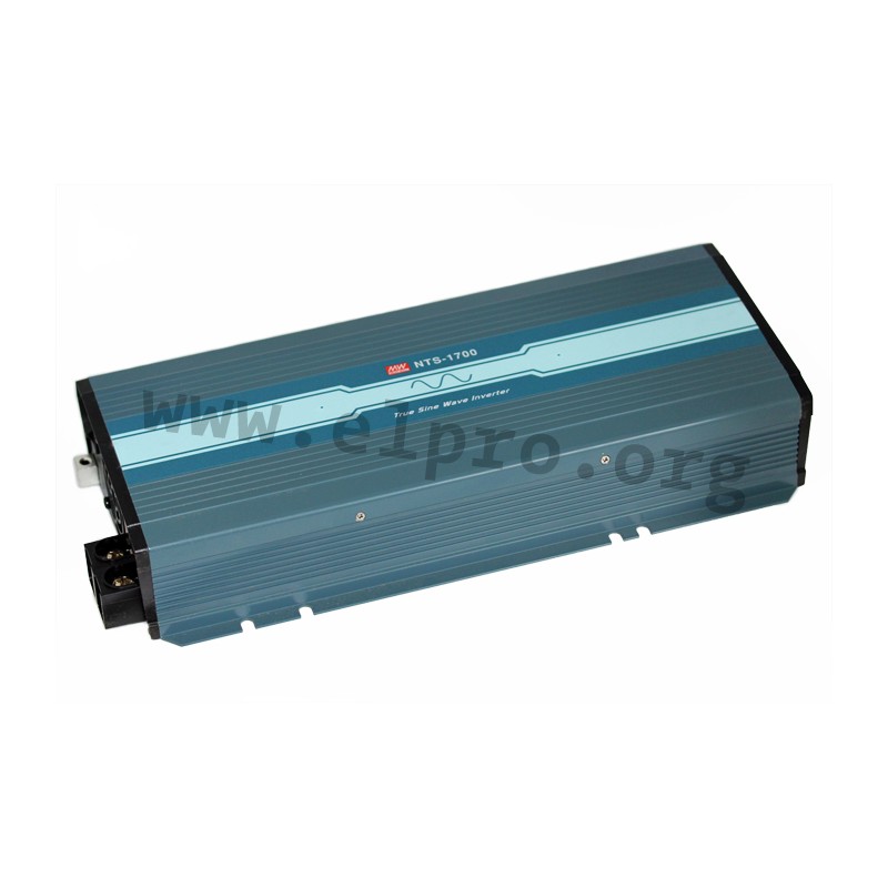 Inverters in an enclosed housing with 1700W, a pure sine wave output (THD<3%) and a remote ON/OFF control. These devices have a selectable output voltage and are protected against overload, overtemperature, overvoltage, short circuit as well as reverse polarity. They switch off when a battery is too deeply discharged and comply with EN62368-1, IEC62368-1 as well as EN55032 class A. We offer the following types of this Mean Well series: NTS-1700-212EU, NTS-1700-224EU and NTS-1700-248EU.