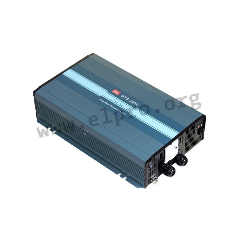 Inverters in an enclosed housing with 2200W, a remote ON/OFF control and an adjustable output voltage. These devices have a pure sine wave output (THD<3%) and are protected against overload, overvoltage, overtemperature as well as short circuit. They are suitable for Li-ion as well as lead-acid batteries, have a peak power of up to 4400W and comply with EN62368-1, EN55032 class A, EN61000-3-2 as well as EN61000-3-3. We offer the following types of this Mean Well series: NTS-2200-212EU, NTS-2200-224EU and NTS-2200-248EU.