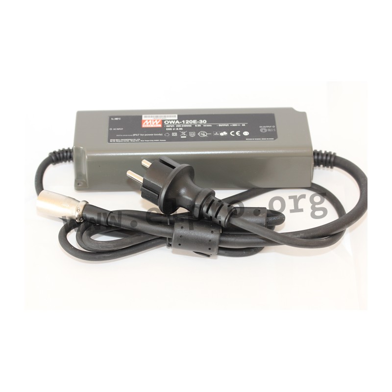 Desktop switching power supplies in a plastic housing (IP67) with 120W, energy efficiency Level VI, insulation class II, a universal input and a low no-load power. These devices have a built-in active PFC function and are protected against overload, overtemperature, short circuit as well as overvoltage. They have a fanless design and comply with EN61558-1, EN61558-2-16, EN55032 class B, EN55014-1, EN61000-3-2 as well as EN61000-3-3. We offer the following types of this Mean Well series: OWA-120E-12, OWA-120E-15, OWA-120E-20, OWA-120E-24, OWA-120E-30, OWA-120E-36, OWA-120E-42, OWA-120E-48 and OWA-120E-54.
