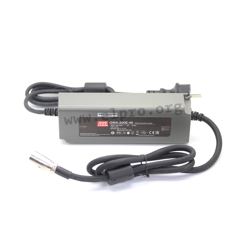 Desktop switching power supplies in a plastic housing (IP67) with 200W, a low no-load power consumption, energy efficiency Level VI and protection class II. These devices have a built-in active PFC function and are protected against overvoltage, overload, overtemperature as well as short circuit. They comply with EN61558-2-16, EN61558-1, IEC61558-2-16, IEC61558-1, EN60335-1, EN55032 class B as well as EN55014. We offer the following types of this Mean Well series: OWA-200E-12, OWA-200E-20, OWA-200E-24, OWA-200E-36, OWA-200E-42, OWA-200E-48 and OWA-200E-54.