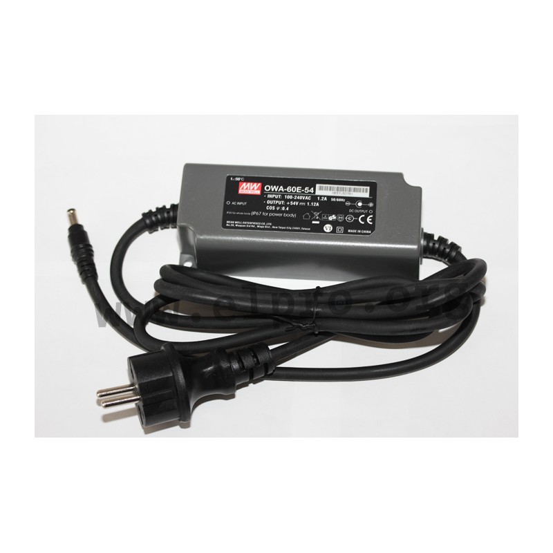 Desktop switching power supplies in a plastic housing (IP67) with 60W, insulation class II, a low no-load power, energy efficiency Level VI and a universal input. These devices have a fanless design and are protected against overtemperature, short circuit, overvoltage as well as overload. They are very efficient and comply with EN61558-1, EN61558-2-16, EN55032 class B, EN55014-1 as well as EN61000-3-2 class A. We offer the following types of this Mean Well series: OWA-60E-12, OWA-60E-15, OWA-60E-20, OWA-60E-24, OWA-60E-30, OWA-60E-36, OWA-60E-42, OWA-60E-48 and OWA-60E-54.
