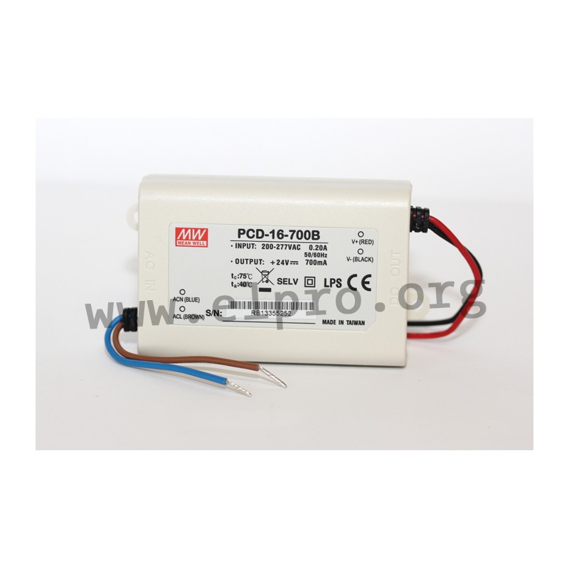 LED drivers in a plastic housing (IP42) with AC dimming, a constant current, a stranded wire connection and 16W. These devices are protected against overtemperature, overload (auto recovery) as well as short circuit and comply with EN61000-3-2, Class C, EN55015, EN61347-1 as well as EN61347-2-13. They have a built-in active PFC function and are suitable for phase-cut and phase-angle dimmers as well as for LED lighting applications. We offer the following types of this Mean Well series: PCD-16-350B, PCD-16-700B, PCD-16-1050B and PCD-16-1400B.