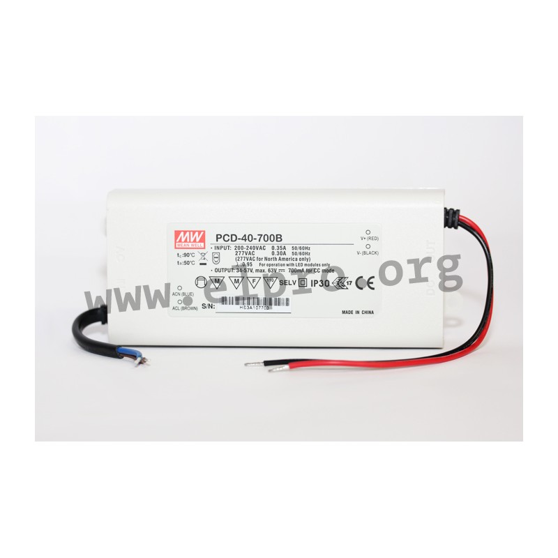 LED drivers in a plastic housing (IP42) with AC dimming, 40W and a stranded wire connection. These devices are suitable for phase control dimmers / reverse phase control dimmers as well as for LED lighting applications and comply with EN61000-3-2, class C, EN55015, EN61347-1 as well as EN61347-2-13. They are protected against overvoltage, short circuit as well as overheat and have a built-in active PFC function. We offer the following types of this Mean Well series: PCD-40-350B, PCD-40-500B, PCD-40-700B, PCD-40-1050B, PCD-40-1400B and PCD-40-1750B.