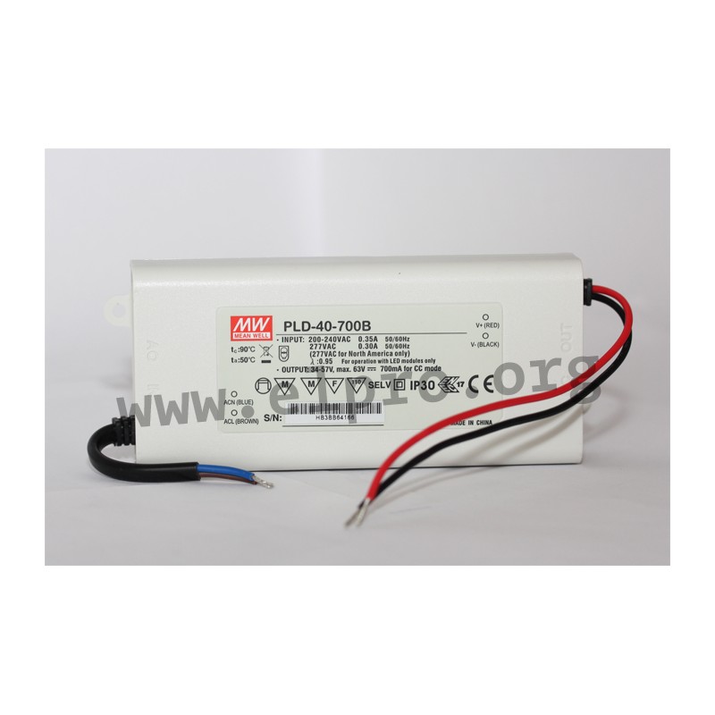 LED drivers in a plastic housing (IP42) with a constant current, 40W and a stranded wire connection. These devices comply with EN61000-3-2, class C, EN55015, EN61347-1 as well as EN61347-2-13 and are suitable for LED lighting applications. They are protected against overvoltage, overheat as well as short circuit and have a built-in active PFC function. We offer the following types of this Mean Well series: PLD-40-350B, PLD-40-500B, PLD-40-700B, PLD-40-1050B, PLD-40-1400B and PLD-40-1750B.