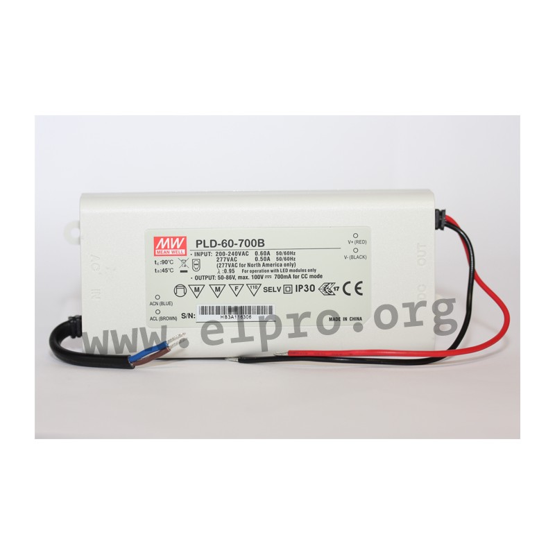 LED drivers in a plastic housing (IP42) with a stranded wire connection, 60W and a constant current. These devices are protected against overload (auto recovery), overvoltage, short circuit as well as overtemperature and comply with EN61000-3-2, class C, EN55015, EN61347-1 as well as EN61347-2-13. They have a built-in active PFC function and are suitable for LED lighting applications. We offer the following types of this Mean Well series: PLD-60-500B, PLD-60-700B, PLD-60-1050B, PLD-60-1400B, PLD-60-1750B, PLD-60-2000B and PLD-16-2400B.