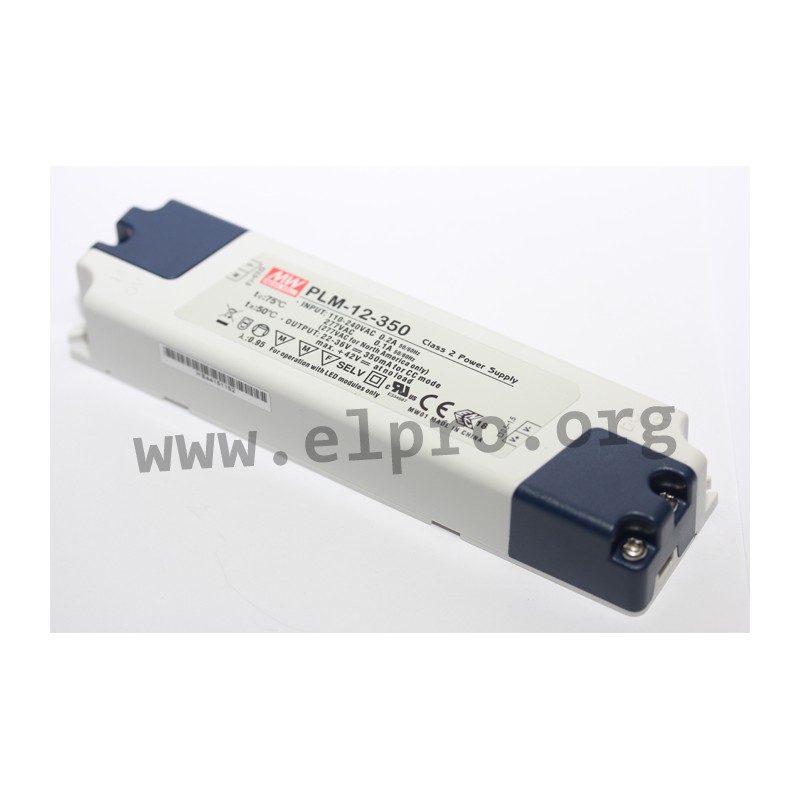 LED drivers in a plastic housing (IP30) with a low no-load power, 12W and a universal input. These devices are protected against overload (auto recovery) as well as short circuit, are suitable for LED lighting applications and are not dimmable. They comply with EN61000-3-2, Class C, EN55015, EN61347-1 as well as EN61347-2-13 and have a built-in active PFC function. We offer the following types of this Mean Well series: PLM-12E-350, PLM-12E-500, PLM-12E-700, PLM-12E-1050, PLM-12-350, PLM-12-500, PLM-12-700 and PLM-12-1050.