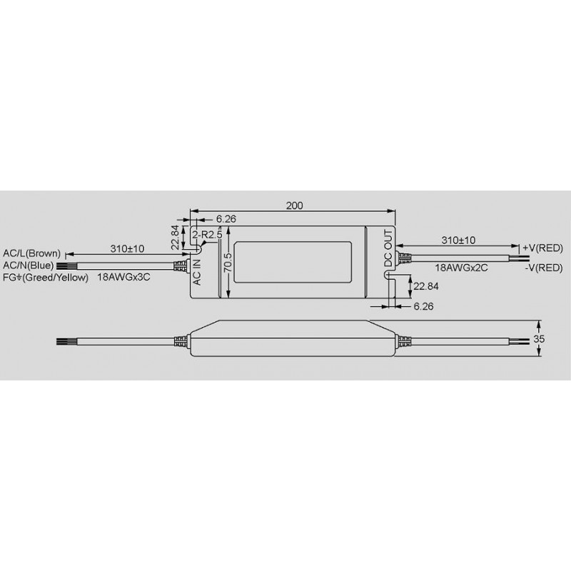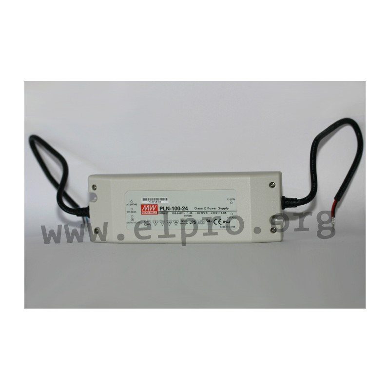 LED drivers in a plastic housing (IP64) with a universal input, an adjustable output current, an adjustable output voltage and 100W. These devices comply with UL1310 Class 2, EN61000-3-2 Class C, EN55015, EN61347-1 as well as EN61347-2-13 and are suitable for LED lighting applications. They have a built-in active PFC function and are protected against overload (auto recovery), overvoltage as well as short circuit. We offer the following types of this Mean Well series: PLN-100-12, PLN-100-15, PLN-100-20, PLN-100-24, PLN-100-27, PLN-100-36 and PLN-100-48.