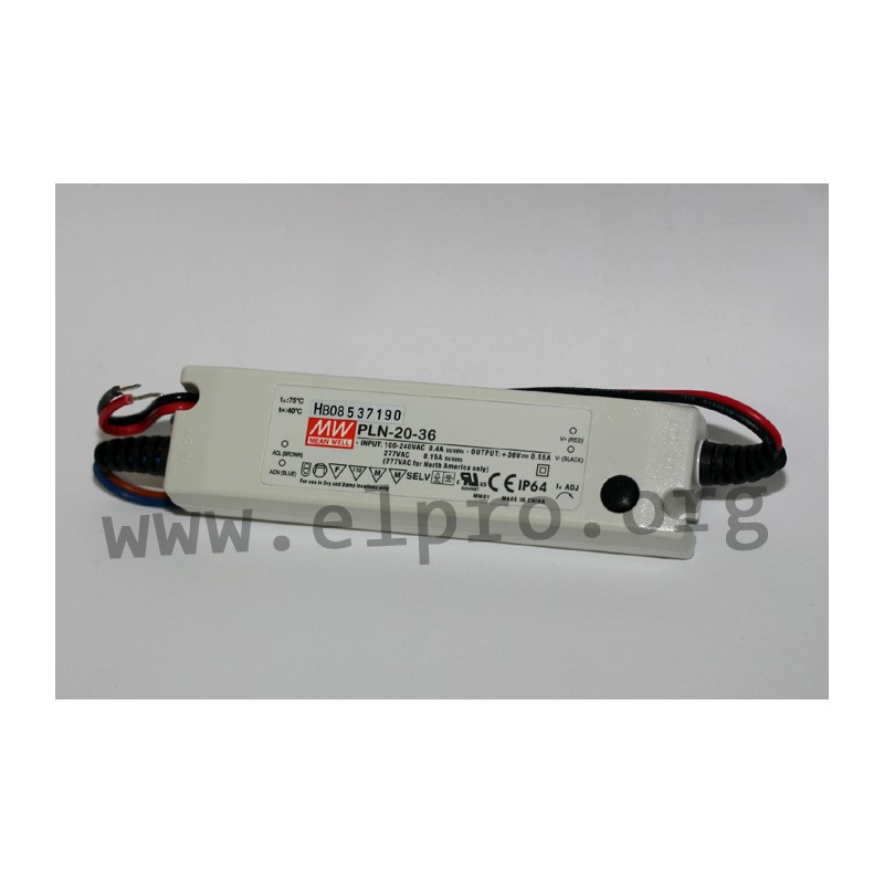 LED drivers in a plastic housing (IP64) with a constant voltage, a universal input, 20W and a constant current (mixed mode). These devices comply with EN61000-3-2, Class C, EN55015, EN61347-1 as well as EN61347-2-13 and are protected against overload (auto recovery), short circuit as well as overvoltage. They are suitable for LED lighting applications and are not dimmable. We offer the following types of this Mean Well series: PLN-20-12, PLN-20-18, PLN-20-24, PLN-20-36 and PLN-20-48.