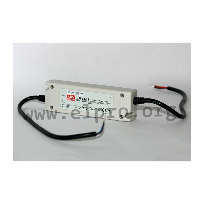 LED drivers in a plastic housing (IP64) with a constant voltage / constant current (mixed mode), 30W and a universal input. These devices are protected against overload (auto recovery), short circuit as well as overvoltage and comply with EN61000-3-2 class C, EN55015, EN61347-1 as well as EN61347-2-13. They are suitable for LED lighting applications and are not dimmable. We offer the following types of this Mean Well series: PLN-30-12, PLN-30-15, PLN-30-20, PLN-30-24, PLN-30-27, PLN-30-36 and PLN-30-48.