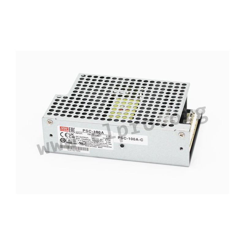 Open-Frame and enclosed type switching power supplies (PSC_-C) with 100W, UPS function (battery charger) and a universal input. These devices have both a power-fail signal as well as a battery-low signal and are protected against overload (auto recovery), overvoltage as well as short circuit. They have a battery deep discharge protection and comply with UL62368-1, EN62368-1, IEC62368-1 as well as EN55032 class B. We offer the following types of this Mean Well series: PSC-100A, PSC-100B, PSC-100A-C and PSC-100B-C.