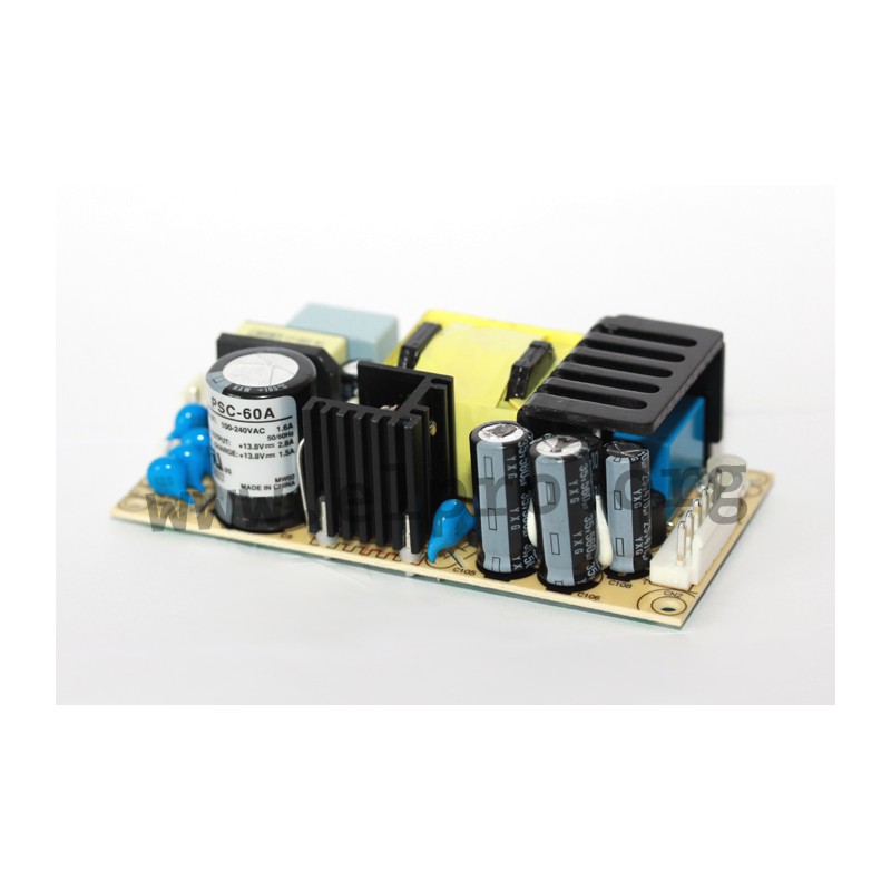 Open frame type switching power supplies with 60W, a battery charger, a battery low protection, a power fail signal, a universal input and a battery low signal. These devices have a UPS function and are protected against overload (auto recovery), overvoltage as well as short circuit. They have a fanless design and comply with UL/EN62368-1, EN55032 class B, EN61000-3-2 as well as EN61000-3-3. We offer the following types of this Mean Well series: PSC-60A and PSC-60B.
