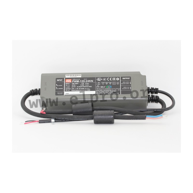 LED drivers in a plastic case with 120W, a constant voltage, protection class II, a low no-load power consumption and an integrated KNX control protocol. These devices have a minimal dimming level of 0,5%, a PWM style output to maintain the colour temperature and the brightness as well as a built-in active PFC function and are protected against overload (auto recovery), overtemperature, overvoltage as well as short circuit. They are suitable for LED lighting applications and comply with EN61347-1, EN61347-2-13, EN55015 as well as EN61000-3-2 class C. The PWM output frequency is adjustable by ETS up to a maximum of 4kHz. We offer the following types of this Mean Well series: PWM-120-12KNX and PWM-120-24KNX.