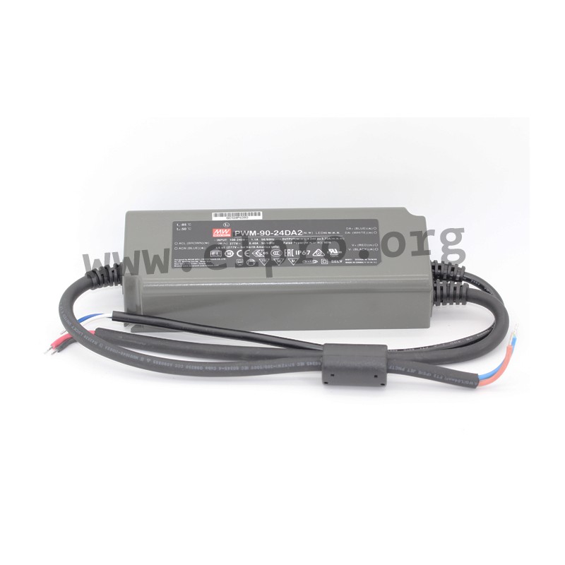 LED drivers in a plastic housing (IP67) with a DALI (PWM-90_DA) resp. a DALI 2.0 interface (PWM-90_DA2), a PWM style output, 90W and a universal input. These devices are protected against overload (auto recovery), overtemperature, overvoltage as well as short circuit and are suitable for LED lighting applications. They comply with EN61347-1, EN61347-2-13 as well as EN55015 and have a built-in active PFC function. We offer the following types of this Mean Well series: PWM-90-12DA, PWM-90-12DA2, PWM-90-24DA, PWM-90-24DA2 and PWM-90-48DA2.