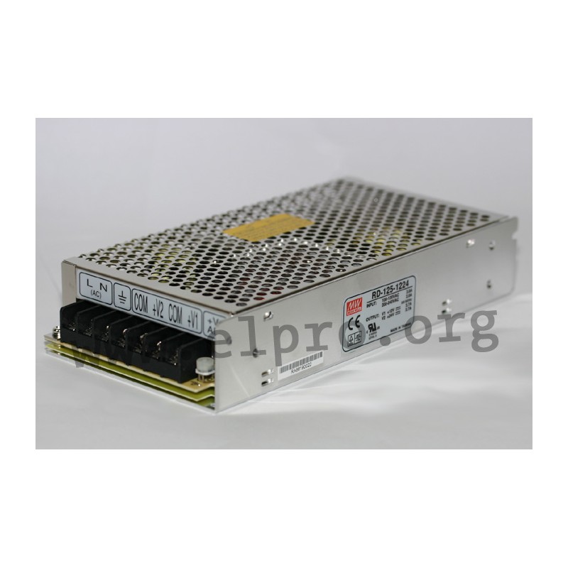 Switching power supplies in an enclosed housing with 125W, screw terminals and long life 105°C caps. These devices have a switch for selecting between 155V or 230V AC input voltage and are protected against short circuit, overload (auto recovery) as well as overvoltage. Furthermore, they have isolated outputs and comply with UL/EN62368-1, EN55032 class B, EN61000-3-2 as well as EN61000-3-3. We offer the following types of this Mean Well series: RID-125-1205, RID-125-1224, RID-125-1248, RID-125-2405 and RID-125-2448.