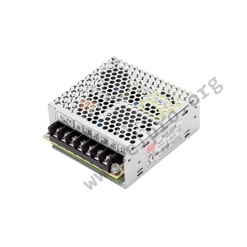 Switching power supplies in an enclosed case with 50W, screw terminals, a universal input and long life electrolytic capacitors. These devices have isolated outputs and are protected against short circuit, overvoltage as well as overload (auto recovery). They have a fanless design and comply with UL62368-1, EN62368-1, EN55032 class B as well as EN61000-4-2. We offer the following types of this Mean Well series: RID-50A and RID-50B.