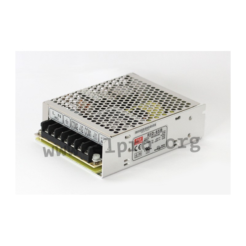 Switching power supplies in an enclosed housing with 65W, screw terminals, a universal input and 105°C long life caps. These devices have isolated outputs for CH1 + CH2 and are protected against short circuit, overload (auto recovery) as well as overvoltage. They comply with EN62368-1, UL62368-1, EN55032 class B as well as EN61000-4-2. We offer the following types of this Mean Well series: RID-65A and RID-65B.