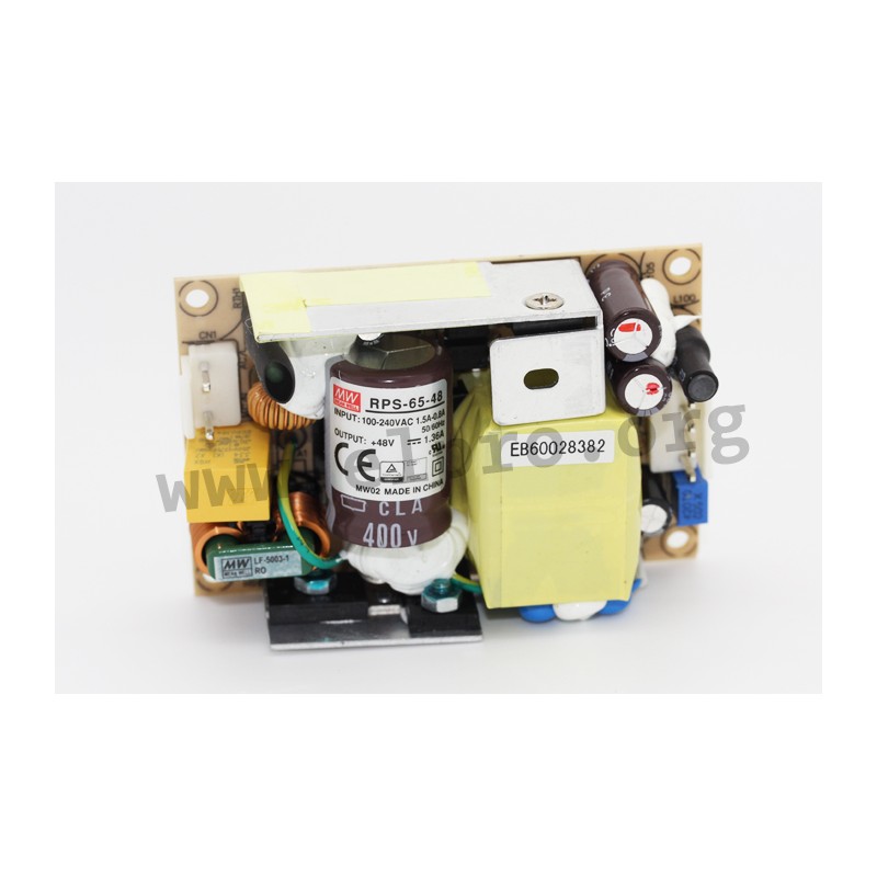 Switching power supplies in a 3"x2" housing (open frame) with 65W, a universal input and a pin strip connection for nylon crimp terminals. These devices are suitable for medical technology applications (2xMOPP) and are protected against overload (auto recovery), overvoltage as well as short circuit. They have a low no-load power (<0,1W) and comply with EN60601-1, EN60335-1, EN55015 class B, EN61000-3-2 as well as EN61000-3-3. We offer the following types of this Mean Well series: RPS-65-3.3, RPS-65-5, RPS-65-7.5, RPS-65-12, RPS-65-15, RPS-65-24 and RPS-65-48.