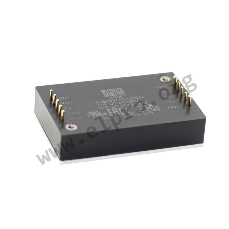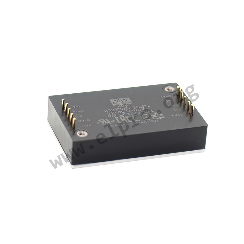 DC/DC converter modules in a Quarter Brick housing (2,28"x1,45"x0,5") with 40W, an input voltage ratio of 12:1 and a remote ON/OFF control. These devices do not require a minimum load, are suitable for PCB mounting and are protected against overload, overtemperature, short circuit as well as overvoltage. They have a trimming output (±10%) and comply with EN55032 class A / class B as well as EN50155 (railway). We offer the following types of this Mean Well series: RQB40W12-110S05, RQB40W12-110S12, RQB40W12-110S24, RQB40W12-110S48 and RQB40W12-110S54.