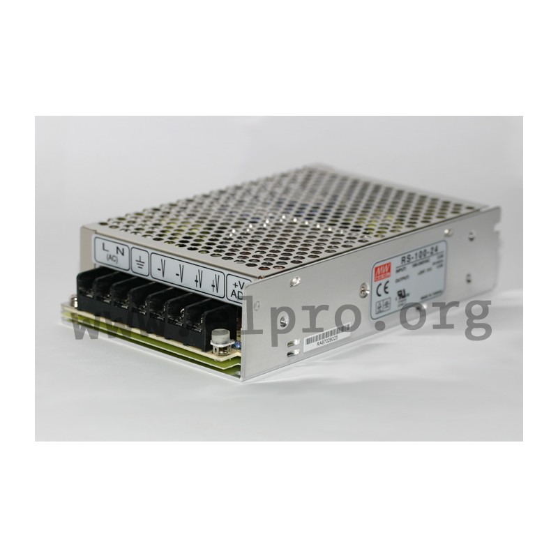 Switching power supplies in an enclosed housing with 100W, a universal input and screw terminals. These devices are using 105°C long life electrolytic capacitors and are protected against overload (auto recovery), overvoltage as well as short circuit. They have a high efficiency and comply with UL62368-1, EN62368-1, EN55032 class B, EN61000-3-2 as well as EN61000-3-3. We offer the following types of this Mean Well series: RS-100-3.3, RS-100-5, RS-100-12, RS-100-15, RS-100-24 and RS-100-48.