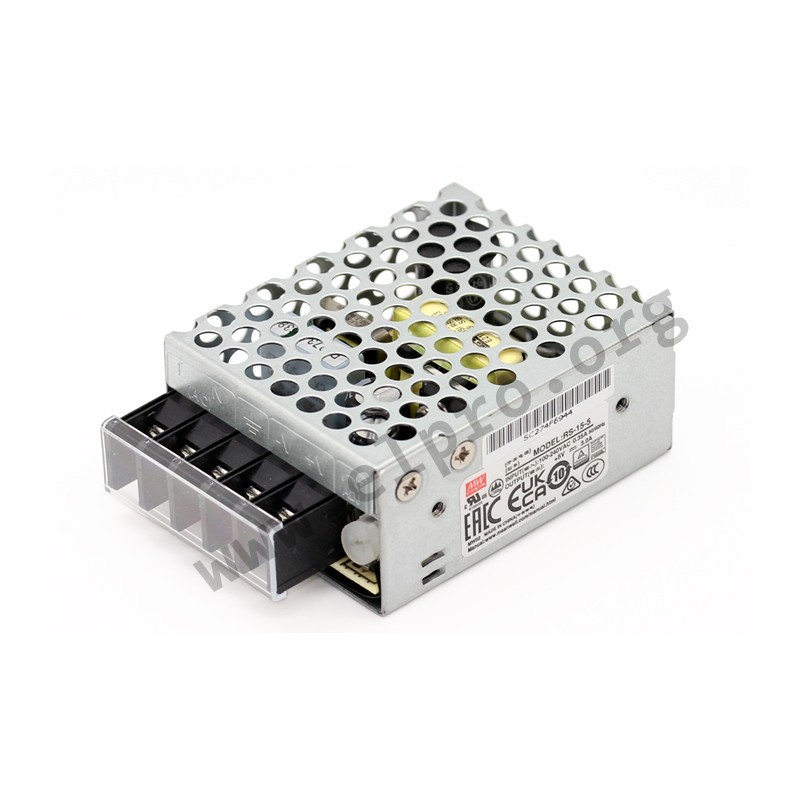 Switching power supplies in an enclosed housing with 15W, a universal input and screw terminals. These devices are using long life caps (105°C) and are protected against overload (auto recovery), overtemperature, overvoltage as well as short circuit. They have a high efficiency as well as a high reliability and comply with EN62368-1, EN55032 class B, EN61000-3-2 as well as EN61000-3-3. We offer the following types of this Mean Well series: RS-15-3.3, RS-15-5, RS-15-12, RS-15-15, RS-15-24 and RS-15-48.